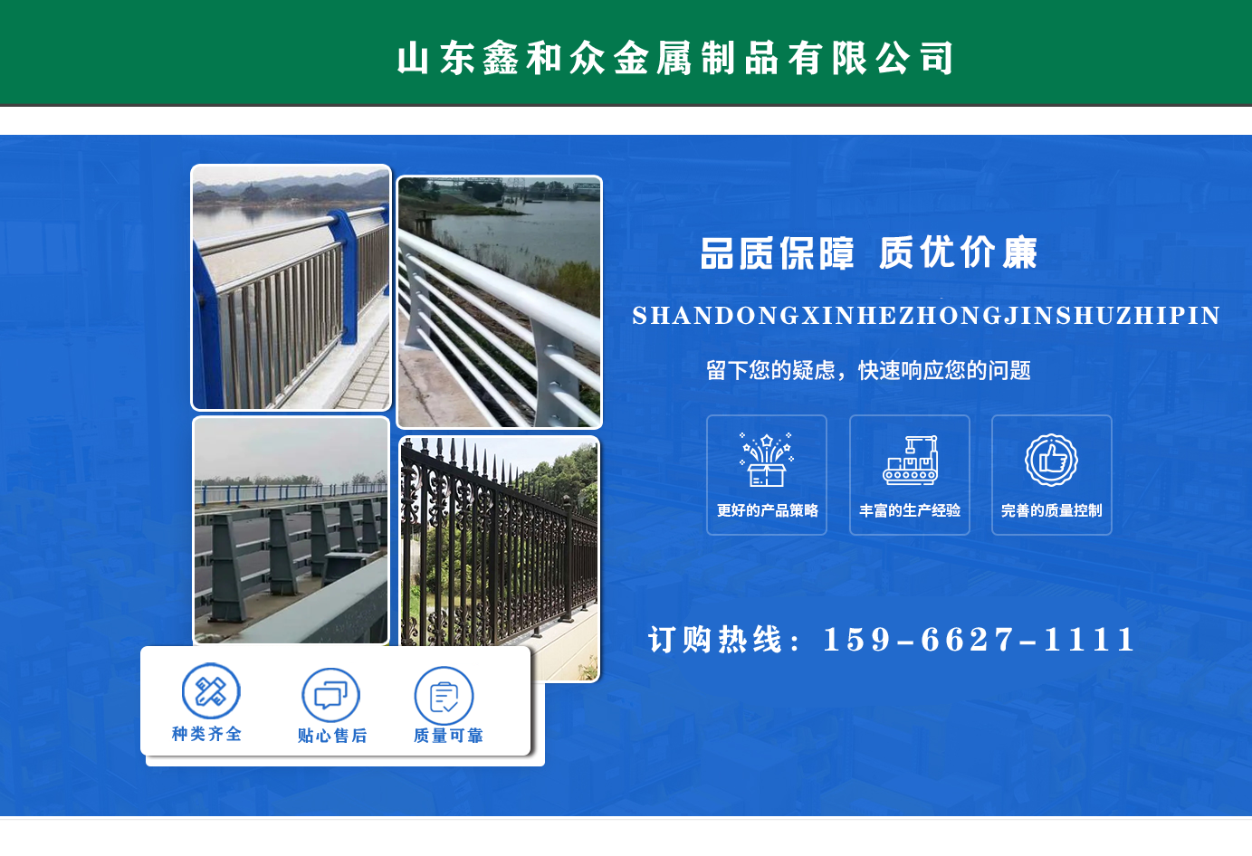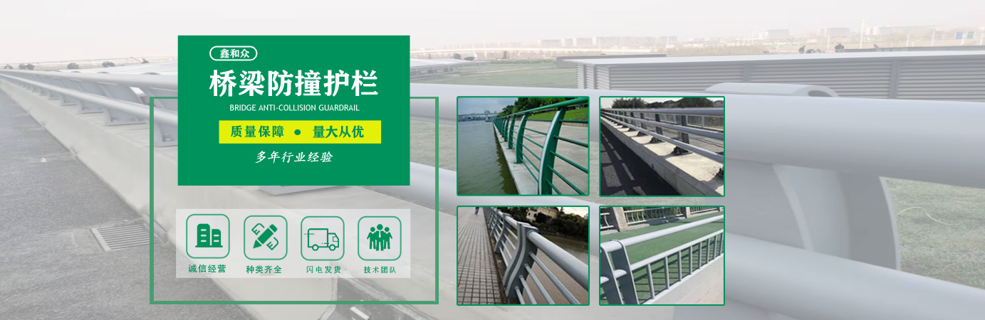 山東鑫和眾金屬制品有限公司主要產(chǎn)品有防撞護(hù)欄,橋梁護(hù)欄,道路護(hù)欄,河道護(hù)欄,不銹鋼護(hù)欄等護(hù)欄。提供設(shè)計(jì)方案,一站式定制,包您滿意價(jià)格優(yōu)惠,歡迎來電咨詢!    公司常年從事銷售護(hù)欄防撞護(hù)欄,橋梁護(hù)欄,道路護(hù)欄,河道護(hù)欄,不銹鋼護(hù)欄,橋梁鋼護(hù)欄,河道燈光護(hù)欄等。產(chǎn)品廣泛應(yīng)用于橋梁、河道、旅游景區(qū)、道路、公路、公園、小區(qū)、景觀、道路防撞等領(lǐng)域?!   」井a(chǎn)品均采用優(yōu)質(zhì)不銹鋼材料,符合相關(guān)標(biāo)準(zhǔn)。各種型號(hào)不銹鋼復(fù)合管及護(hù)欄,質(zhì)量嚴(yán)格把控。產(chǎn)品強(qiáng)度高、耐腐蝕、焊接牢固、抗沖擊、性能好,防撞護(hù)欄結(jié)構(gòu)簡(jiǎn)單、美觀實(shí)用大方?!    g迎前來訂購(gòu)!...